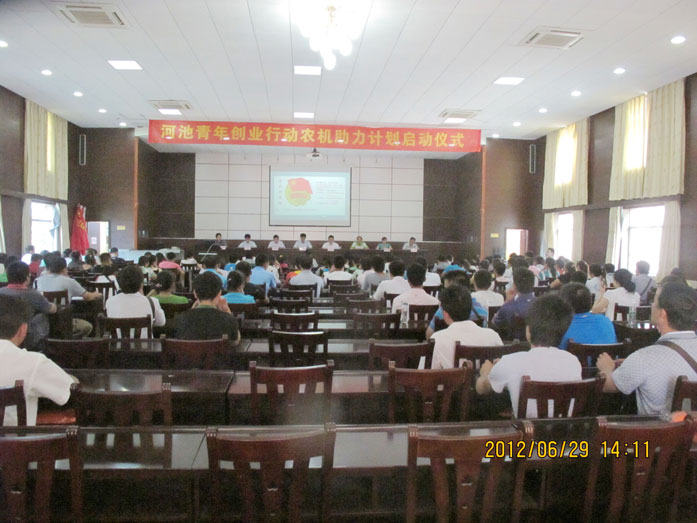 2012年6月29日,河池團(tuán)市委在宜州市舉行青年創(chuàng)業(yè)行動(dòng)農(nóng)機(jī)助力活動(dòng)啟動(dòng)儀式。河池團(tuán)市委副書記黃澤同志、宜州市人民政府副市長(zhǎng)藍(lán)吉陽(yáng)同志、桂林高新區(qū)科豐機(jī)械有限責(zé)任公司銷售總監(jiān)楊毅民同志等領(lǐng)導(dǎo)出席會(huì)議。宜州團(tuán)市委領(lǐng)導(dǎo)、市農(nóng)機(jī)局領(lǐng)導(dǎo)、各鄉(xiāng)鎮(zhèn)團(tuán)委書記或負(fù)責(zé)人、各村(社區(qū))團(tuán)支部書記、科豐公司農(nóng)機(jī)經(jīng)銷商代表、創(chuàng)業(yè)青年代表近200人參加活動(dòng)儀式。