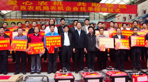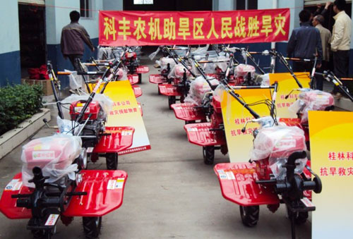 2010年4月1日,兩輛身披“科豐農(nóng)機助旱區(qū)人民戰(zhàn)勝旱災”、“一方有難 八方支援”、“響應政府號召投身抗旱前線”的紅色橫幅,裝載著價值80000多元的微耕機等科豐牌系列農(nóng)機具,帶著科豐公司全體員工對廣西旱區(qū)受災群眾拳拳愛心的科豐抗旱賑災物資車,正整裝待發(fā)地朝著廣西農(nóng)業(yè)裝備展示中心方向駛進。