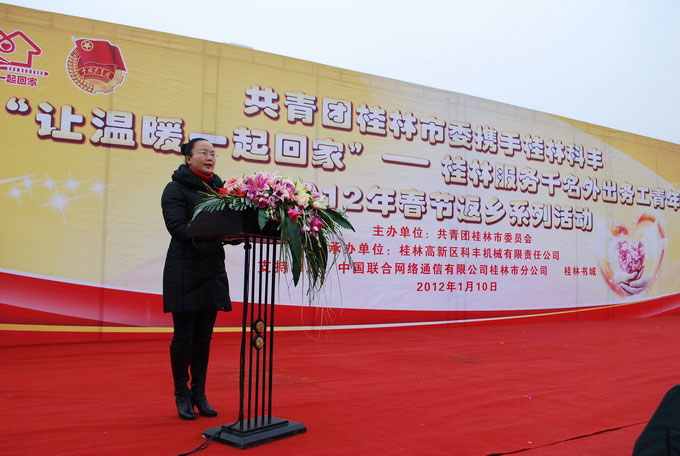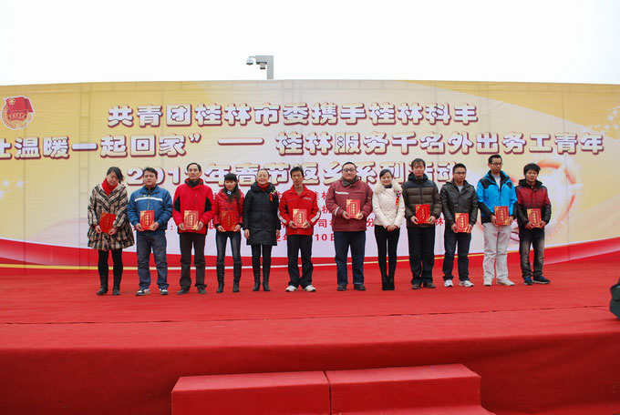1月10日,團(tuán)桂林市委攜手桂林科豐在市中心廣場舉行“讓溫暖一起回家”桂林服務(wù)千名外出務(wù)工青年春節(jié)返鄉(xiāng)系列活動,市人大常委會副主任魯圣發(fā)出席,并為優(yōu)秀進(jìn)城務(wù)工青年頒獎。