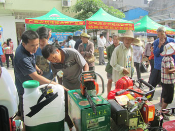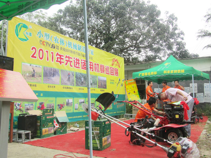 此次活動特邀了廣西桂林高新區(qū)科豐機(jī)械有限責(zé)任公司、廣西五菱南寧桂花車輛有限公司、廣西柳州五菱柳機(jī)動力有限公司等10家農(nóng)機(jī)生產(chǎn)企業(yè),組織36名技術(shù)人員和13輛宣傳大蓬車,帶上手扶式水稻插秧機(jī)、微型耕整(作)機(jī)、小型植保機(jī)、背負(fù)式水稻(甘蔗)收割機(jī)、手提式電鋸等11個品種46臺套(件)先進(jìn)適用農(nóng)機(jī)具、各種宣傳資料等,以防城區(qū)的華石鎮(zhèn)為宣傳展(演)示始點,分別到了峒中鎮(zhèn)、里火邊境村莊、東興市的馬路鎮(zhèn)等9個鄉(xiāng)、鎮(zhèn)(街、村),行程720公里。
